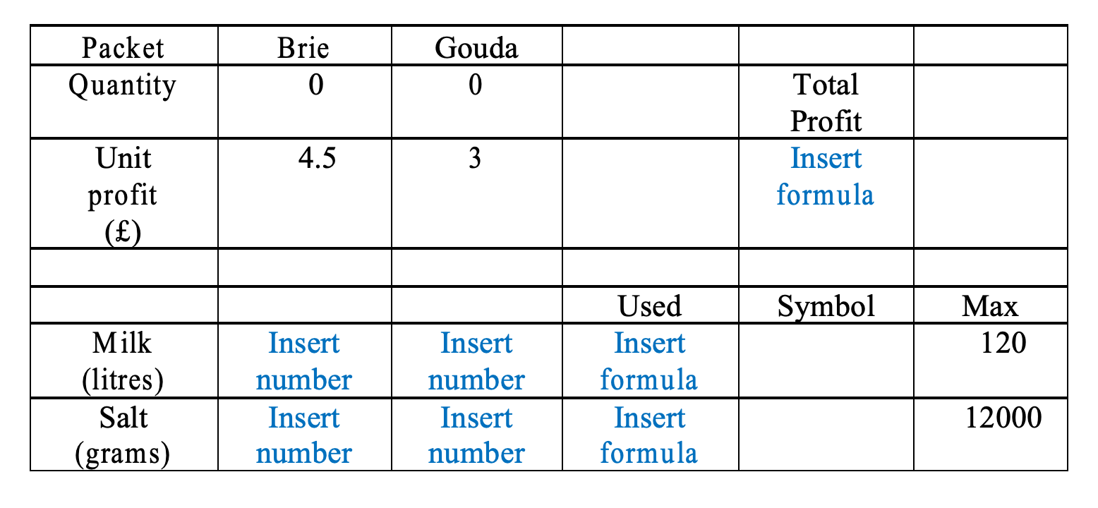 A small cheese maker specialises in two types of cheese – Brie and Gouda that he makes and sells in packets of 400 grams. The cheese maker has estimated that each packet of Brie uses 1.8 litres of special milk and 100 grams of special salt. For the Gouda cheese packet, the amounts of special milk and salt needed are 1.2 litre and 150 grams respectively. The cheese maker has a limited supply of special milk and salt and a maximum of only 120 litres of milk and 12000 grams of salt is made available each week. Once produced and sold, the Brie packet returns a £4.50 profit and £3 profit for the Gouda cheese.