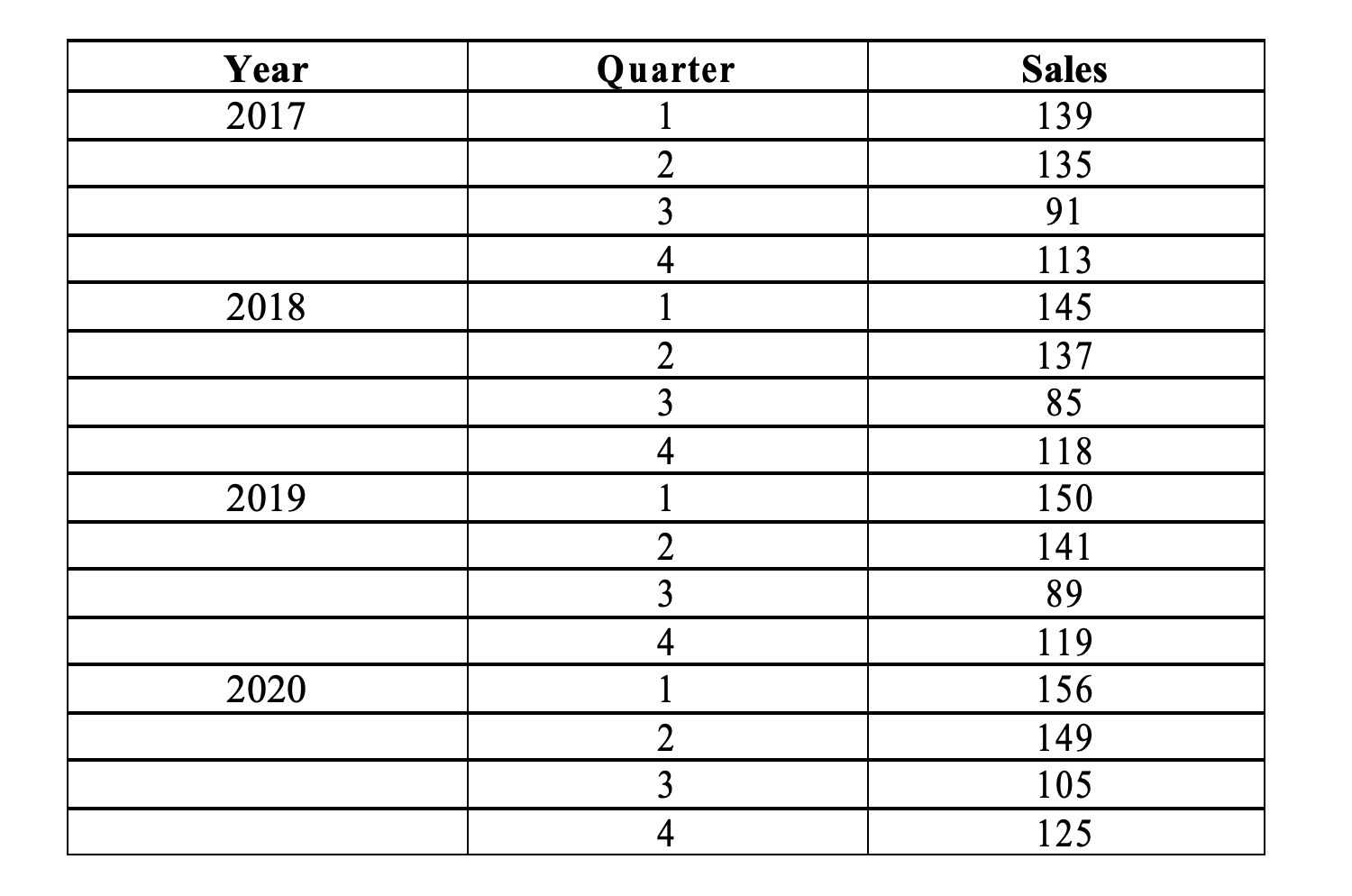 The quarterly sales figures for the number of shoes (pairs) sold at a shoe shop is shown on the table below. Enter the following data into Excel.