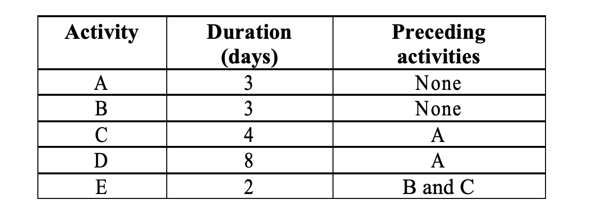 A plumber has decided to use the techniques of project management in order to plan a job. He knew all the different activities of the job, their precedence and their average durations. They are shown on the table below.