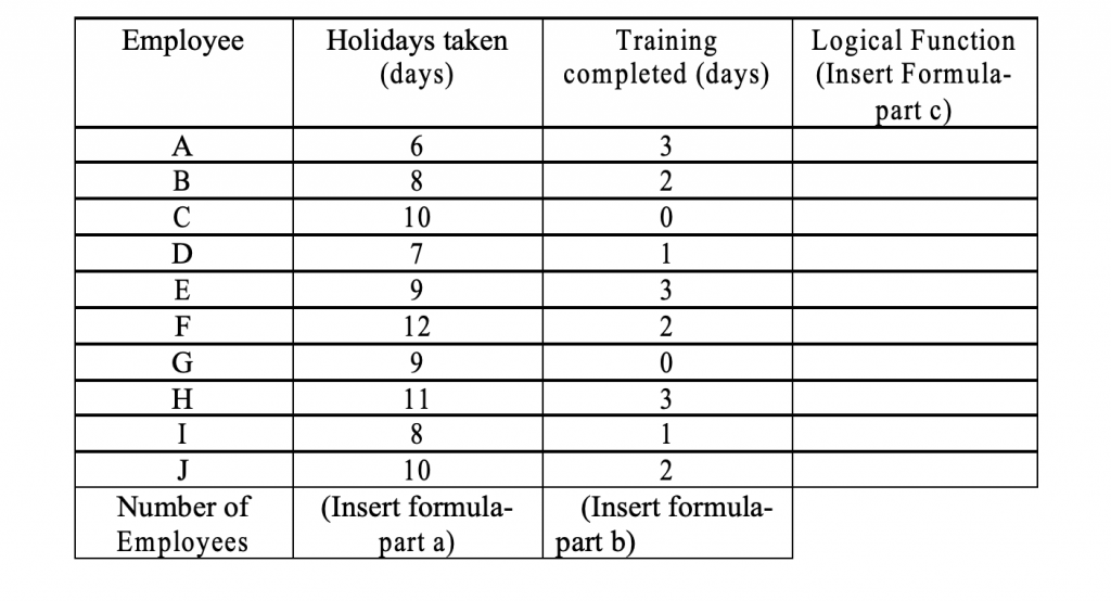 • Write down a logical function with an “IF” statement to test whether an employee has taken more than 9 days as holiday and completed less than 3 training days. You should use “Yes” if the employee has taken more than 9 days as holiday and completed less than 3 training days.